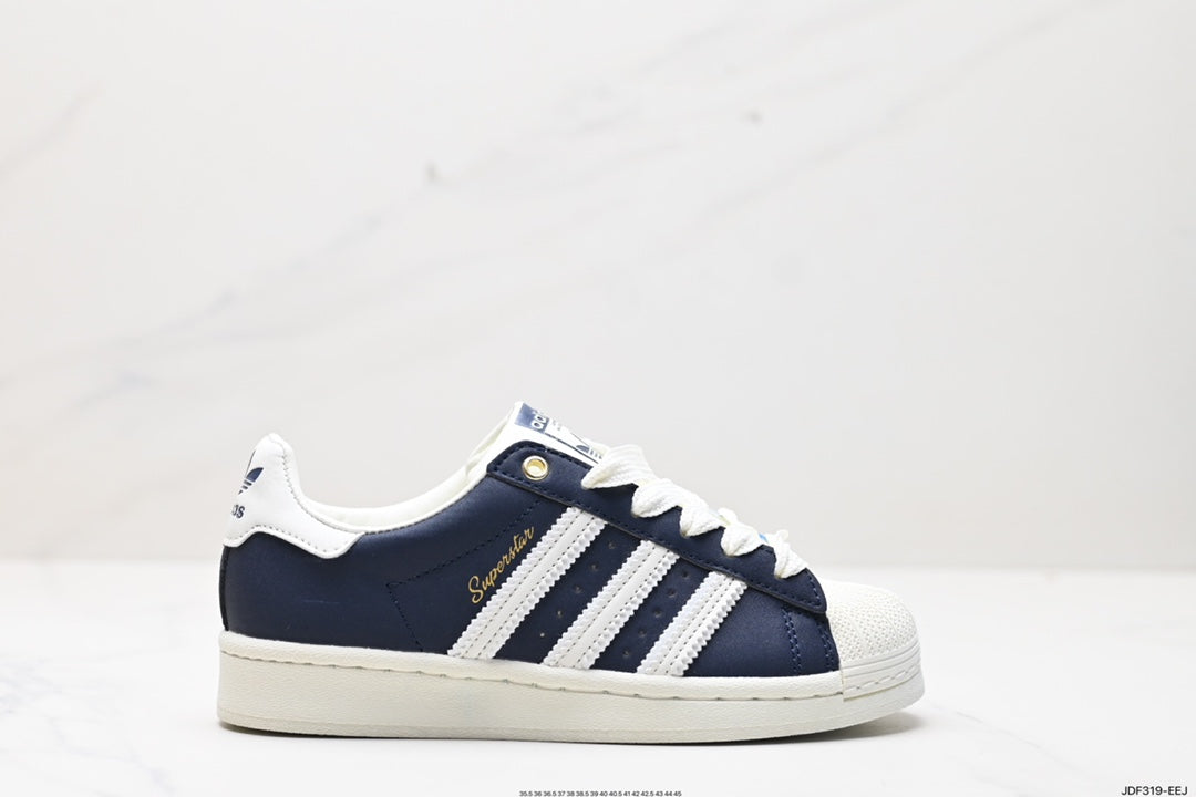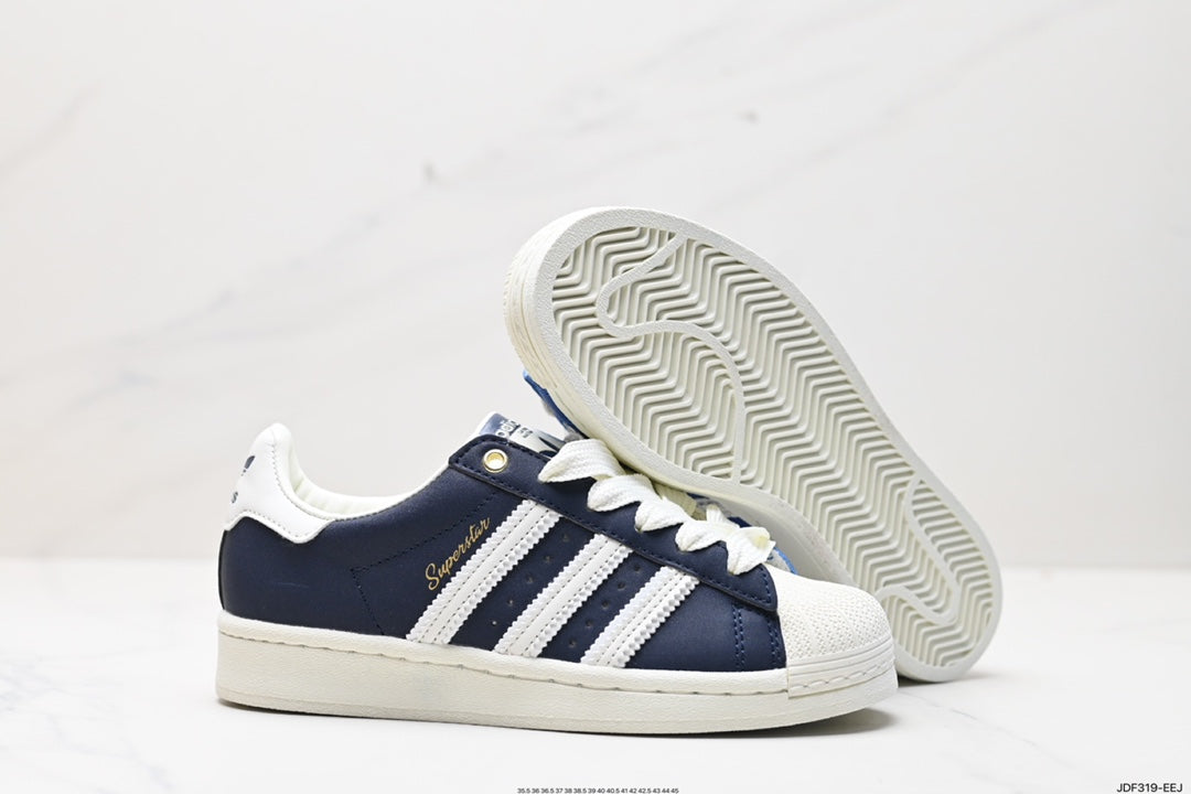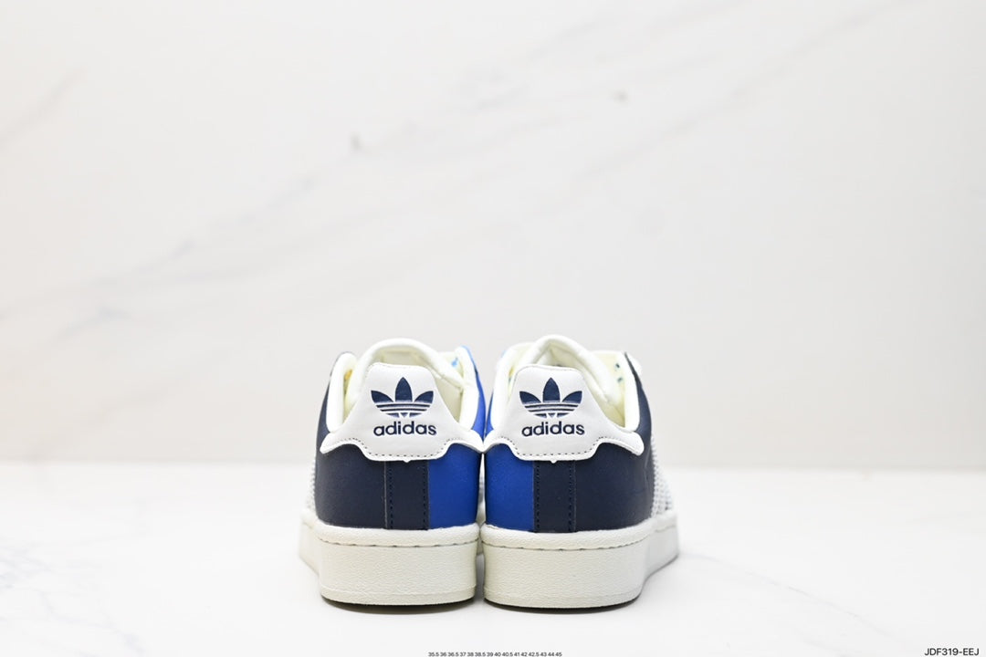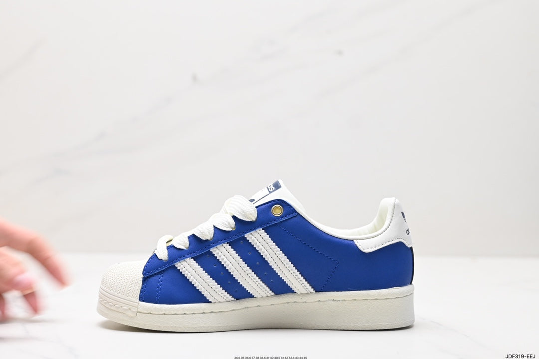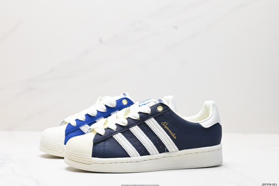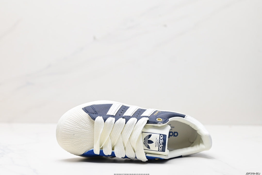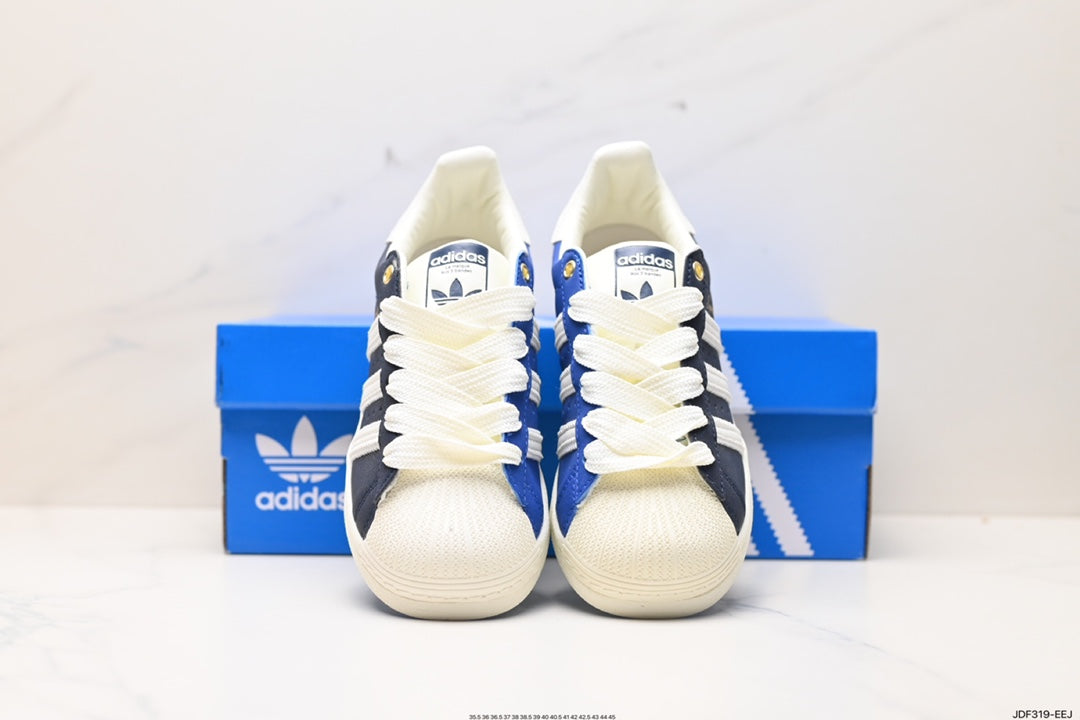 Les Adidas Originals Superstar en coloris bleu et blanc, présentées dans une boîte de style LEGO, marient design iconique et packaging collector. La silhouette combine une tige blanche nette en cuir avec des touches de bleu sur les bandes latérales ou le talon pour un contraste élégant. La boîte s’inspire visiblement de l’univers LEGO, avec un look « brick‑inspired », ce qui en fait un objet à la fois tendance et ludique. Cette édition s’adresse autant aux amateurs de sneakers qu’aux fans de culture streetwear et objets collector.