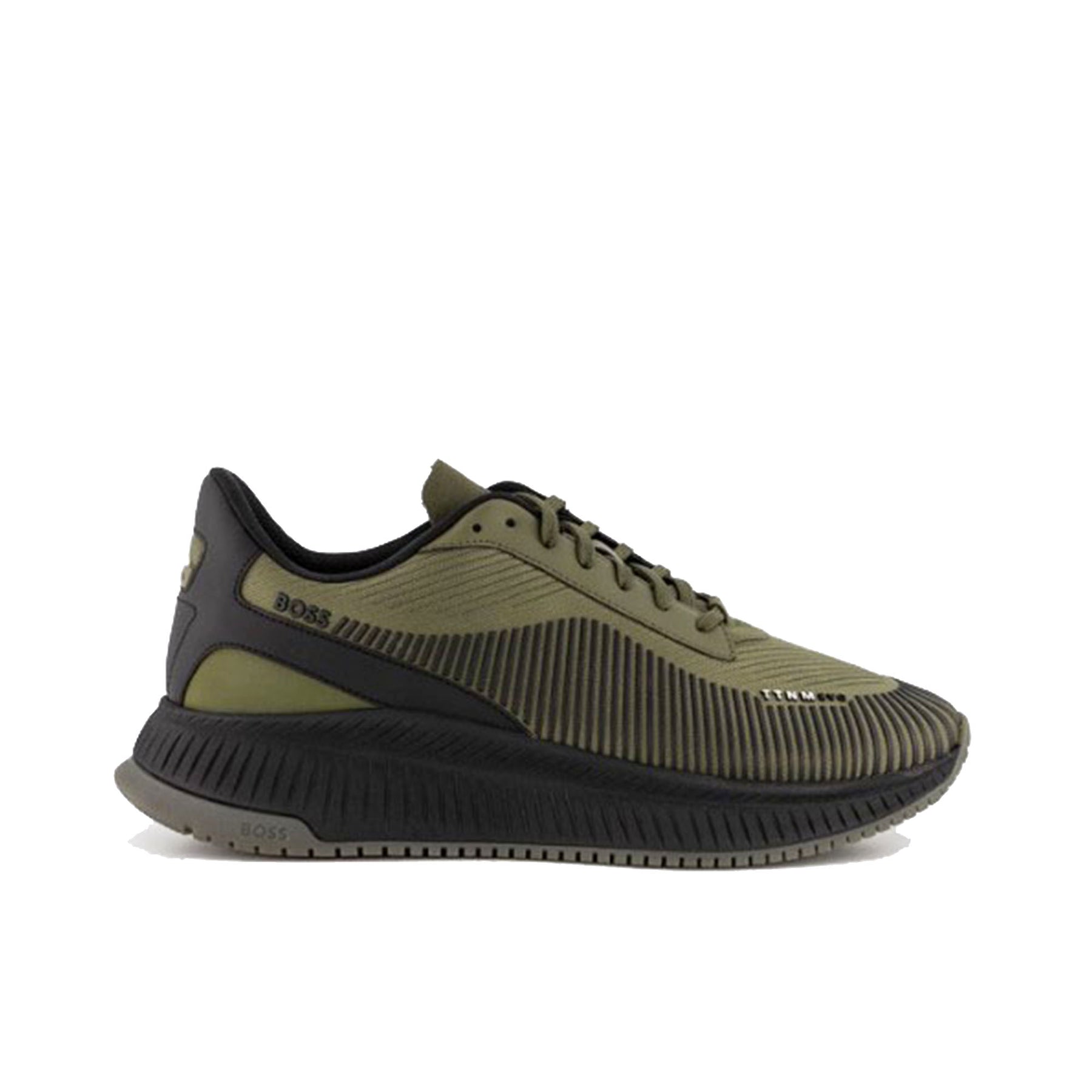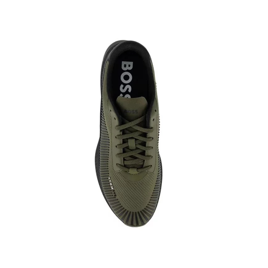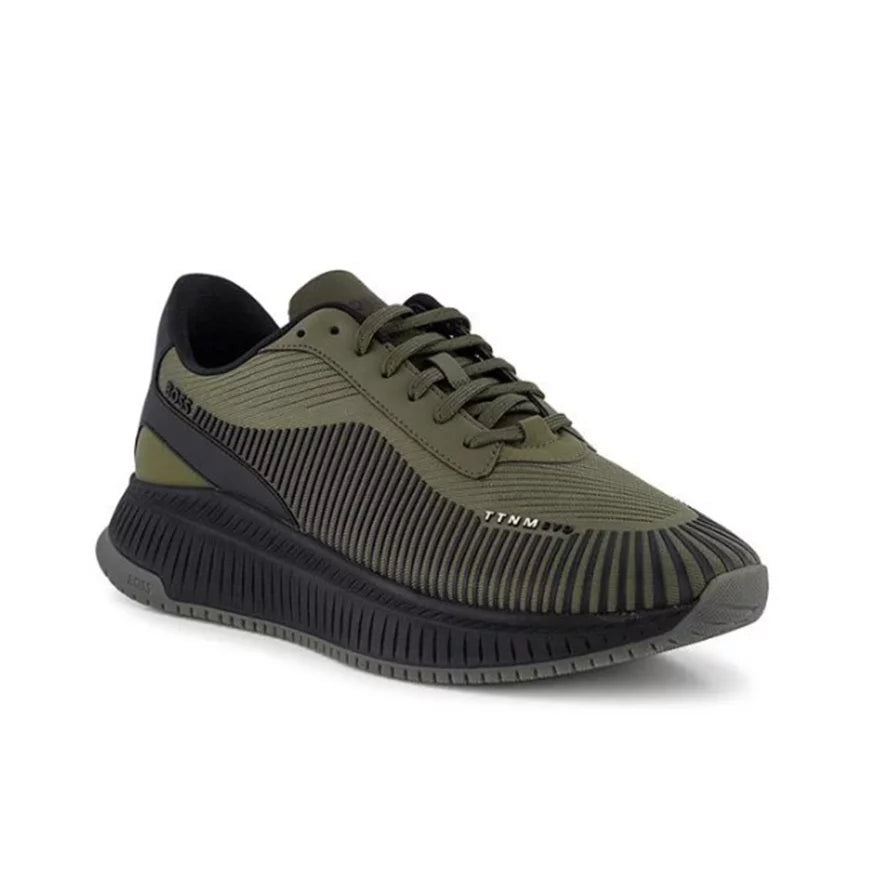 Les baskets basses Boss Ttnm Evo en maille et cuir suédé de couleur kaki allient un design moderne à un confort exceptionnel. Conçues pour offrir à la fois élégance et performance, elles présentent une tige en maille respirante qui assure une légèreté et une aération optimales, tandis que les détails en cuir suédé apportent une touche de luxueuse sophistication. La semelle en caoutchouc garantit une adhérence fiable et un maintien parfait pour toutes vos activités quotidiennes.Le design épuré de ces baskets, associé à la teinte kaki subtile, en fait un choix idéal pour ceux qui recherchent un style à la fois urbain et raffiné. Leur polyvalence permet de les associer à diverses tenues, que ce soit pour une journée décontractée ou une sortie plus habillée. Parfaites pour ceux qui privilégient une chaussure alliant confort, élégance et durabilité, les baskets basses Boss Ttnm Evo en kaki sont un choix incontournable pour une garde-robe moderne et sophistiquée.