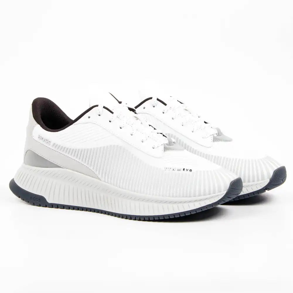 Les baskets BOSS Titanium Evo blanches, alliant maille légère et aspect cuir de qualité, incarnent l’équilibre parfait entre confort et élégance moderne. Leur tige en maille assure une respirabilité optimale et une sensation de légèreté, tandis que les accents en cuir apportent une touche de luxe et de solidité. Grâce à leur semelle en caoutchouc durable, elles offrent une adhérence fiable et un maintien confortable tout au long de la journée.Le design épuré et sophistiqué de ces baskets permet de les intégrer facilement à une variété de looks, qu’ils soient sportifs ou urbains. Leur couleur blanche permet une grande polyvalence, faisant de ces baskets un choix idéal pour une journée de travail ou une sortie décontractée. Parfaites pour ceux qui recherchent une chaussure alliant style intemporel, confort supérieur et praticité, les BOSS Titanium Evo sont un indispensable de toute garde-robe moderne.