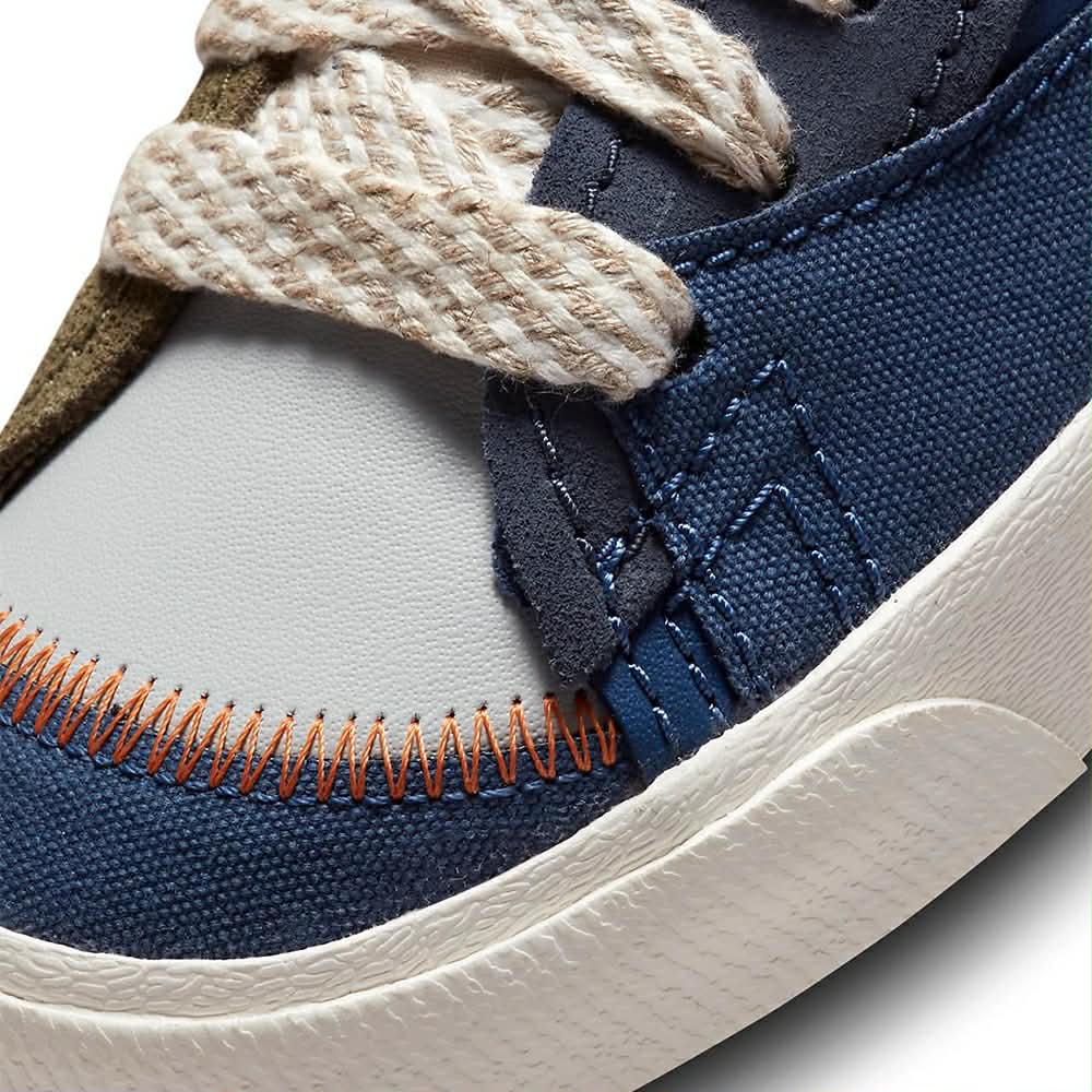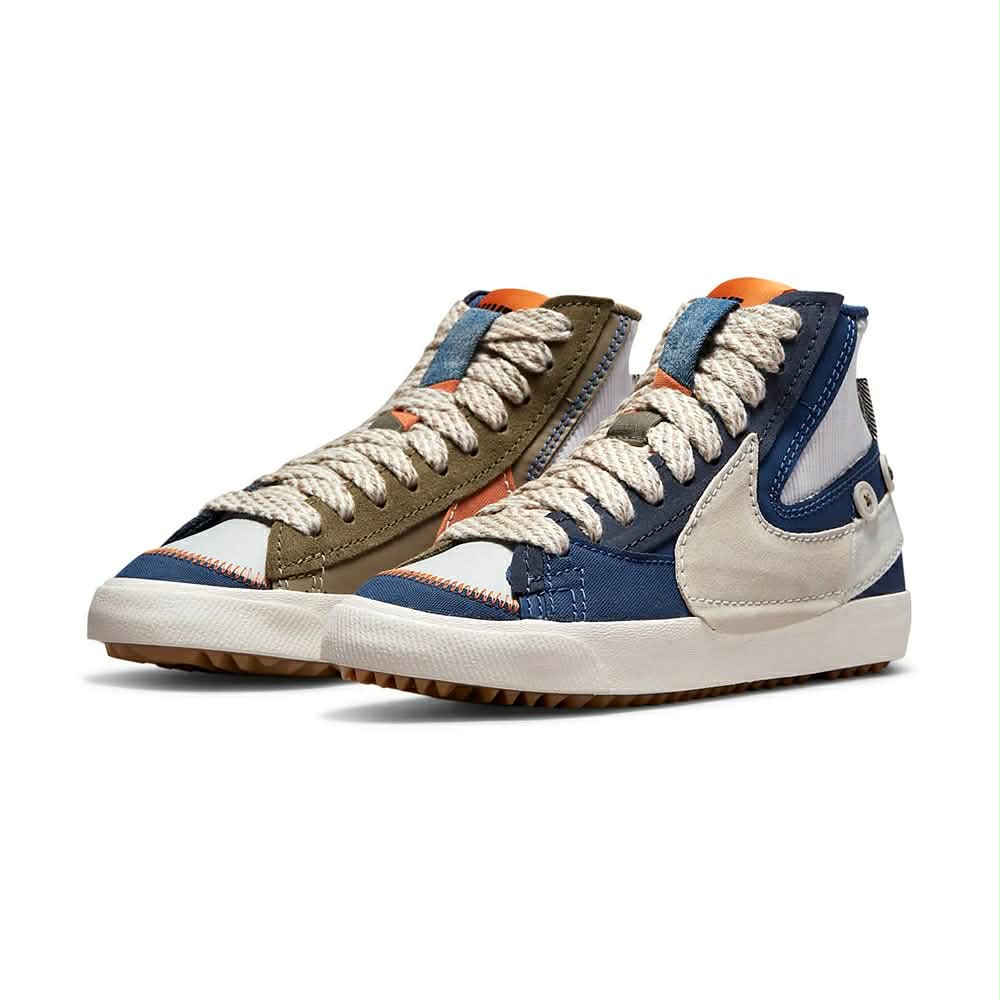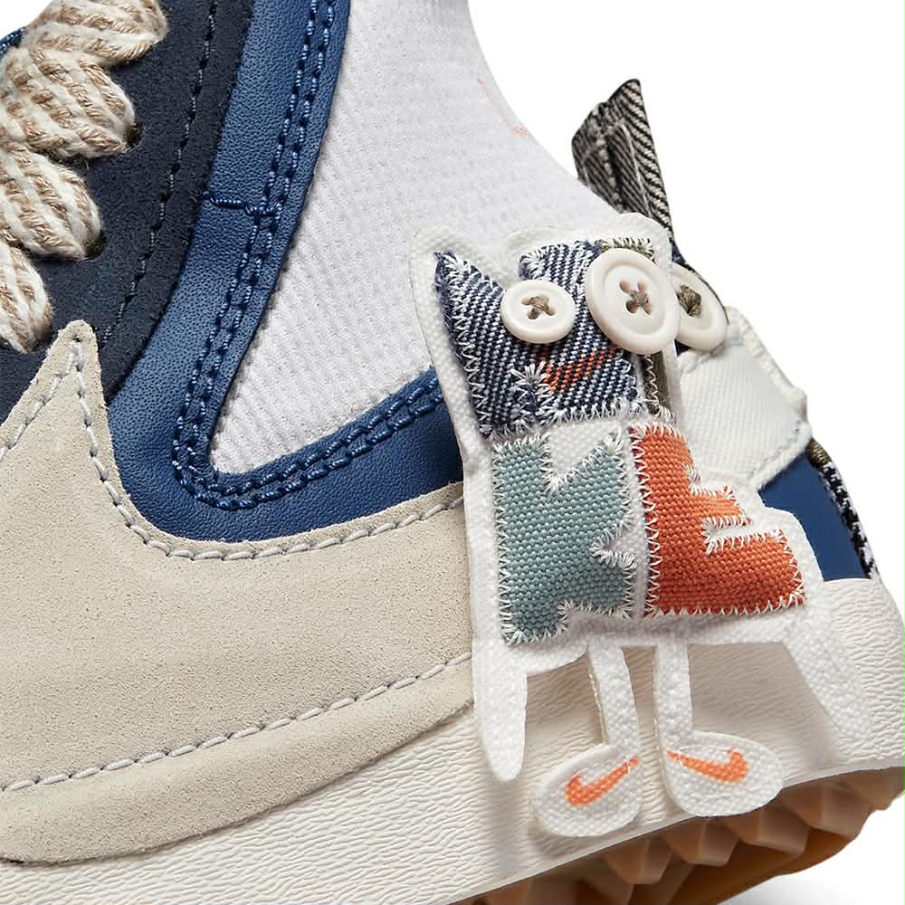La Nike Blazer Mid Jumbo "Voodoo" est une réinterprétation audacieuse du modèle Blazer classique. Elle présente une tige composée de matériaux variés comme le canvas, le suède, le cuir et le textile, avec un design asymétrique où une partie de la chaussure est bleu marine et l'autre vert olive, créant un contraste saisissant. Le modèle se distingue par de gros logos Swoosh "jumbo" qui débordent, des coutures apparentes, des lacets à motifs, et une languette en mousse exposée. Un pendentif en forme de poupée "voodoo" Nike est accroché à la cheville, ajoutant une touche unique. La semelle intermédiaire crème et la semelle extérieure en caoutchouc assurent confort et traction. Ce modèle est destiné à ceux qui recherchent une sneaker originale, expressive et rétro, parfaite pour un look street audacieux.
