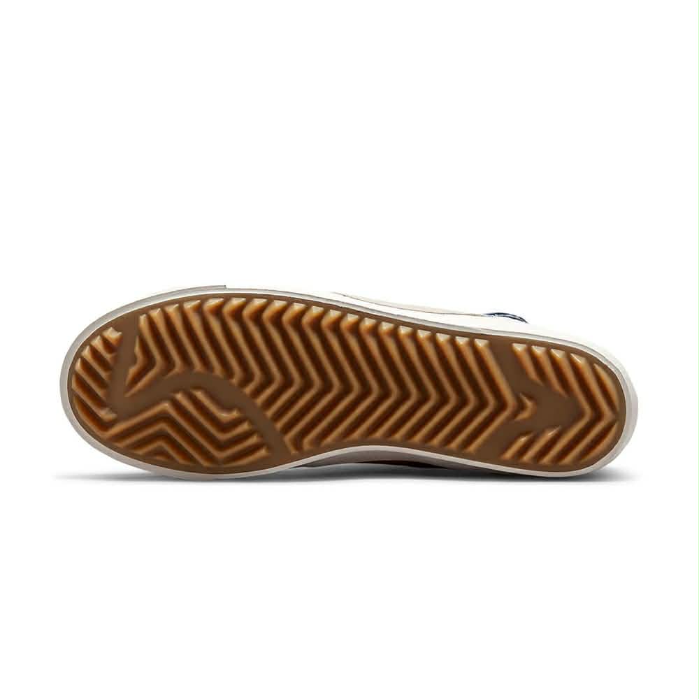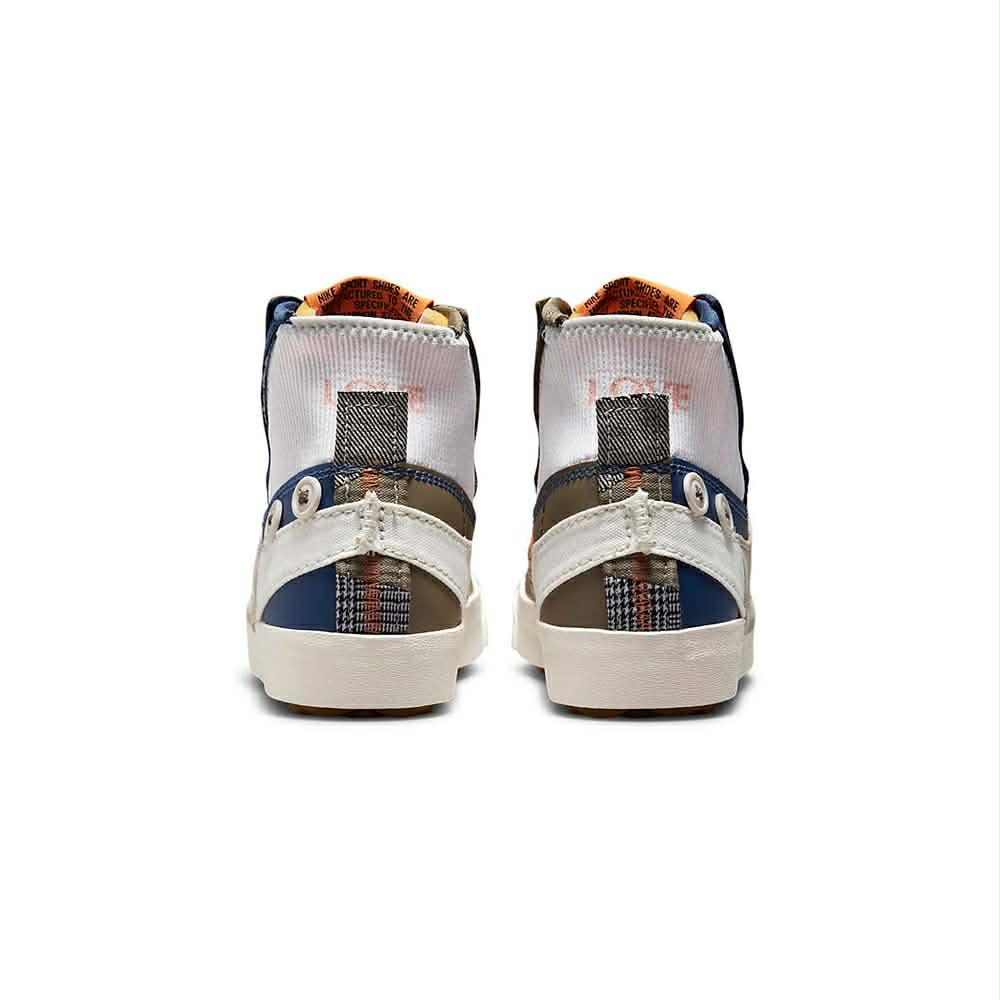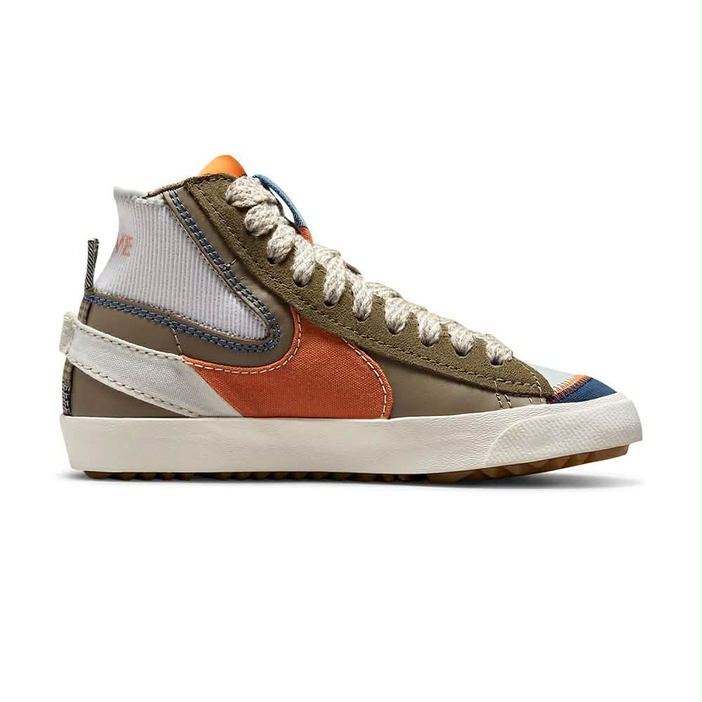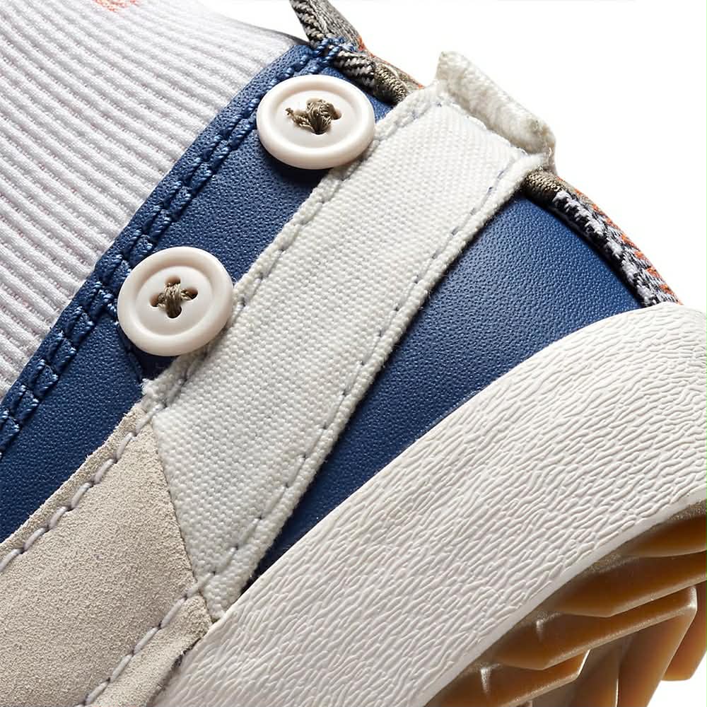 La Nike Blazer Mid Jumbo "Voodoo" est une réinterprétation audacieuse du modèle Blazer classique. Elle présente une tige composée de matériaux variés comme le canvas, le suède, le cuir et le textile, avec un design asymétrique où une partie de la chaussure est bleu marine et l'autre vert olive, créant un contraste saisissant. Le modèle se distingue par de gros logos Swoosh "jumbo" qui débordent, des coutures apparentes, des lacets à motifs, et une languette en mousse exposée. Un pendentif en forme de poupée "voodoo" Nike est accroché à la cheville, ajoutant une touche unique. La semelle intermédiaire crème et la semelle extérieure en caoutchouc assurent confort et traction. Ce modèle est destiné à ceux qui recherchent une sneaker originale, expressive et rétro, parfaite pour un look street audacieux.