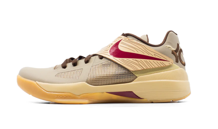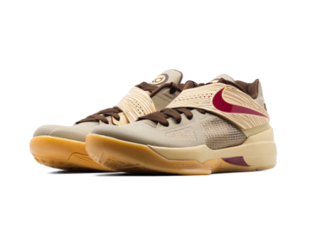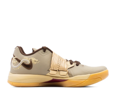 La Nike KD 4 « Year of the Dragon 2.0 » arbore un coloris mêlant kaki, rouge noble, sésame, cacao et gomme jaune. Le dessus combine mesh, ripstop semi‑translucide et renforts synthétiques, et l’on retrouve la célèbre sangle traversante — signature du modèle — pour un maintien ajusté du médio‑pied. Le design intègre des motifs et broderies évoquant le dragon, hommage à l’année du Dragon, notamment autour du logo « KD » au talon. Le Swoosh rouge contraste avec la base kaki/sésame, tandis que la semelle extérieure gomme jaune apporte une touche originale et stylée. Ce modèle est un mélange d’inspiration basketball (avec confort, maintien, structure robuste) et de style urbain — parfait pour ceux qui veulent afficher un look audacieux tout en conservant la dimension performance.